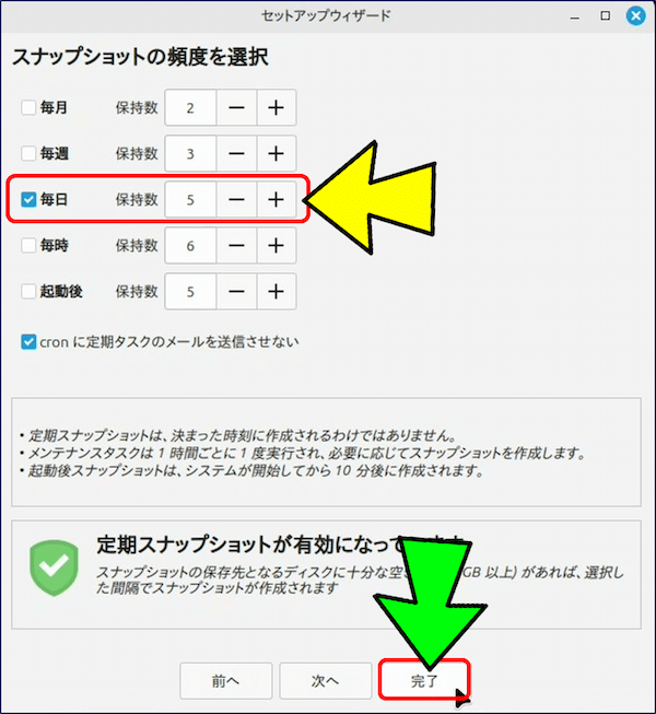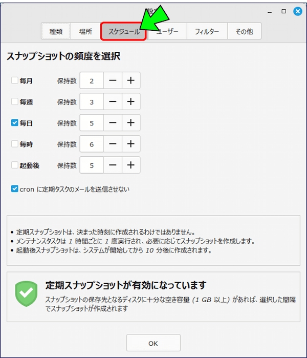 🧩 例:「Daily(毎日)」を選び、保存数を「5」に設定すると、最新5日分が保持され、古いものは自動削除される。