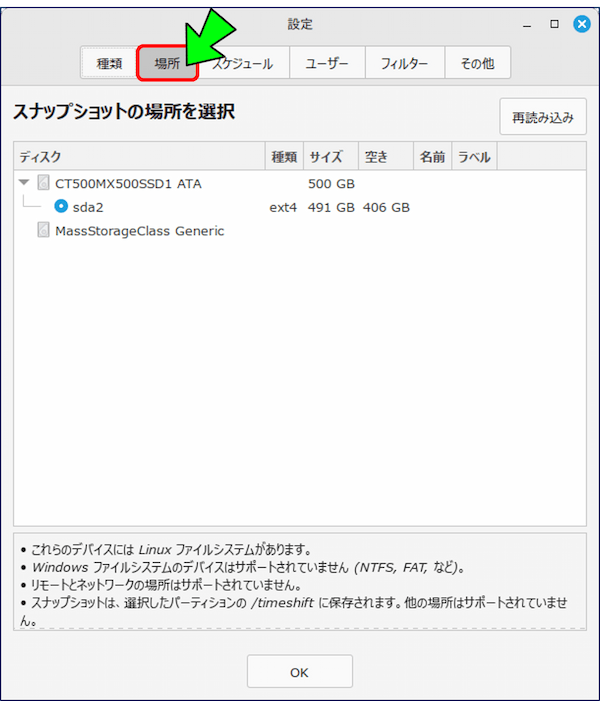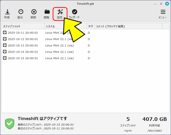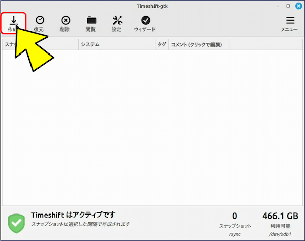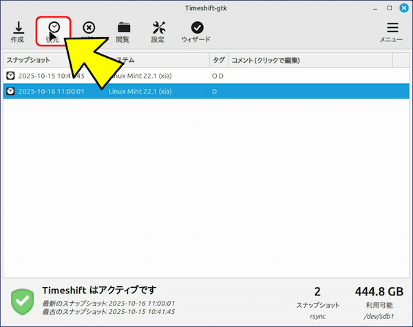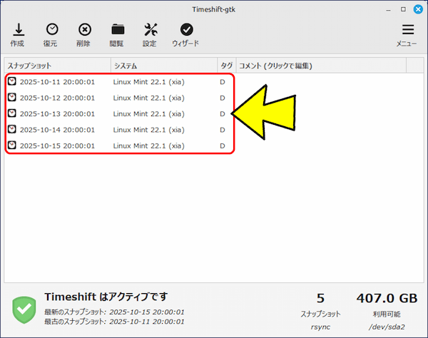 その後、Timeshiftを再起動すればスナップショット一覧が表示されます。