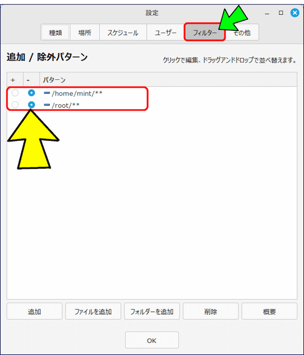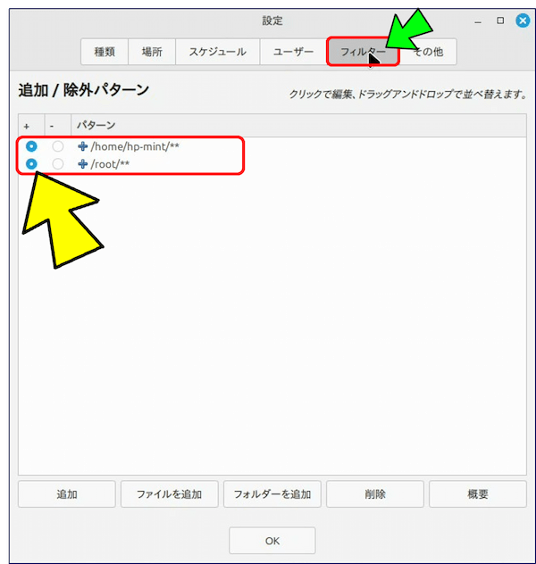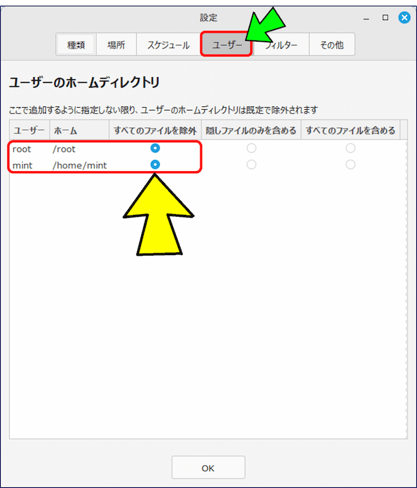 ②.ユーザーのホームディレクトリを、バックアップ対象に設定する。