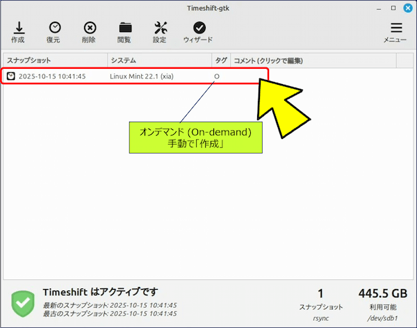 O | オンデマンド (On-demand) | 手動で「作成」ボタンを押したときに作成されるスナップショット | ユーザーが任意で作成 |