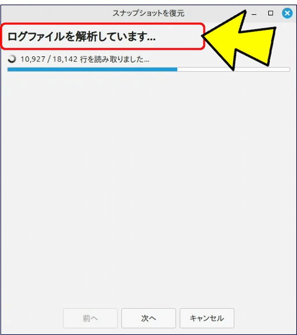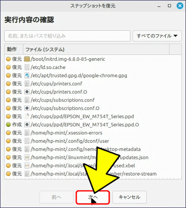 一覧から戻したい日時のスナップショットを選択し、「復元」ボタンをクリック。