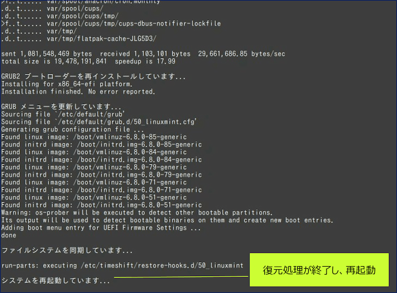 Timeshift の「復元(Restore)」は、次の 2段階 で行われます: