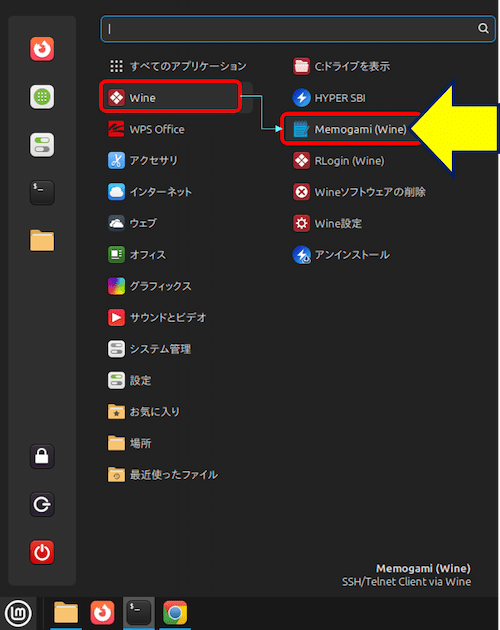Linux Mint には「Wine メニュー」があり、通常は Windows アプリの インストーラ(Setup.exe)を実行したときに Linux Mint のネイティブメニューに自動登録される。