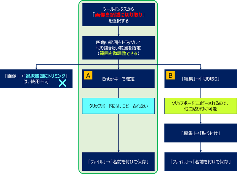 A. 「画像」タブ→「選択範囲にトリミング」で切り取る方法