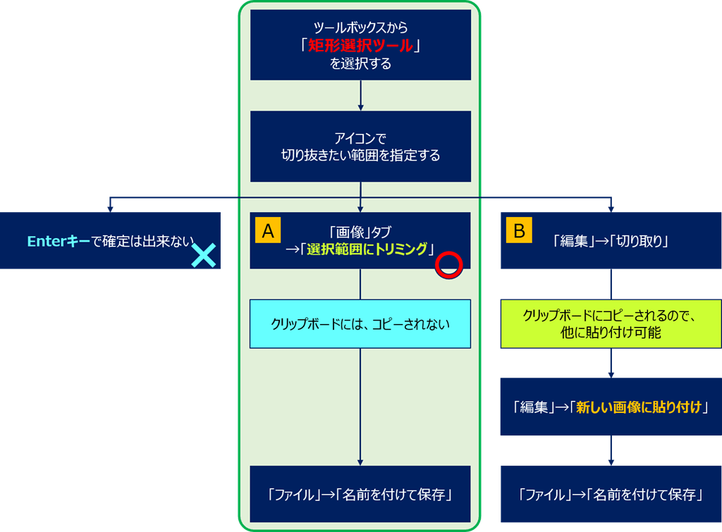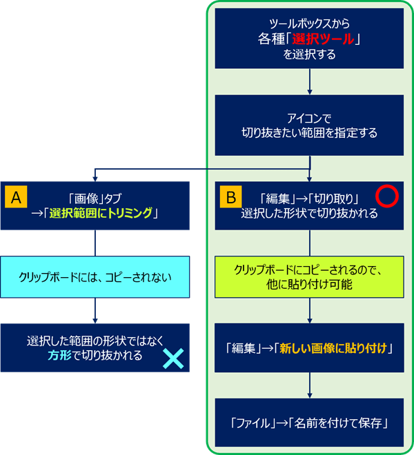 📌 【A】の「選択範囲にトリミング」を使うと、選択した範囲の形状ではなく方形で切り抜かれるため、「編集」→「切り取り」の【B】を使うべし。