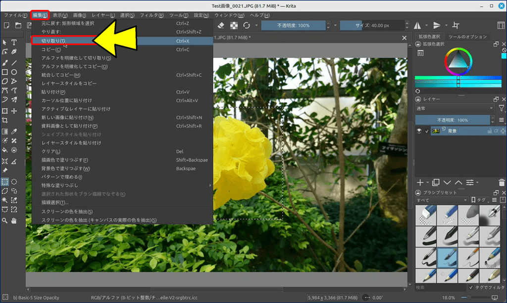 切り取った画像を他に貼り付けたい場合は、メニューバーの「編集」にある「切り取り」を使用する。