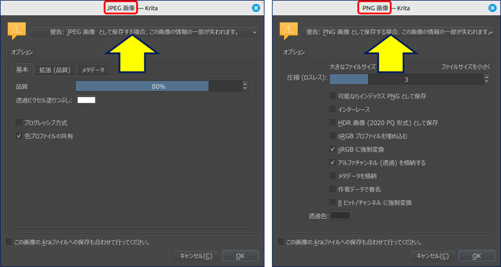 🔹 意味:カメラ写真などに入っていた Exif 情報(撮影日時、カメラ設定、GPS 位置情報など)が画像に含まれているが、Krita から PNG や JPEG に保存するときは「1枚目のレイヤーに付いている情報だけ」が残り、それ以外は破棄される。