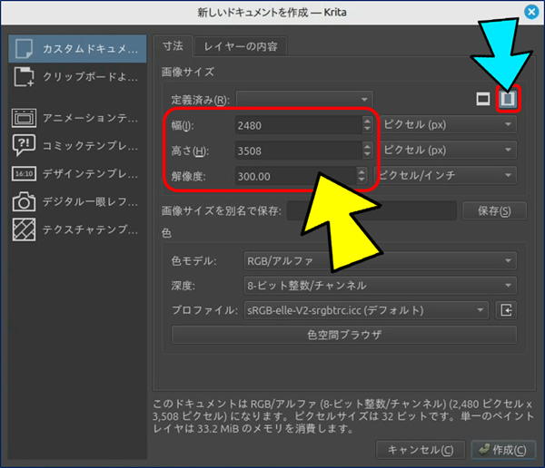 「カスタムドキュメント」を選択し、「寸法」タブで【キャンバスサイズ】と【キャンバスの向き】を設定します。