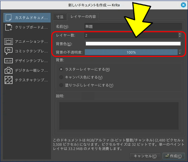 右のレイヤードッカーには、 「背景」と「ペイントレイヤー」の2つのレイヤーが作成されている。