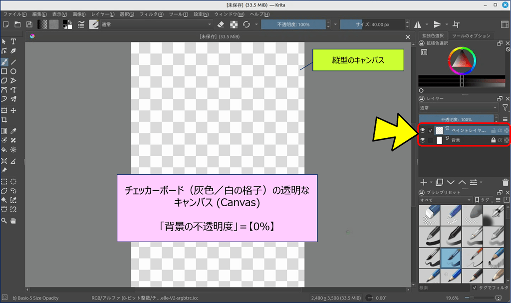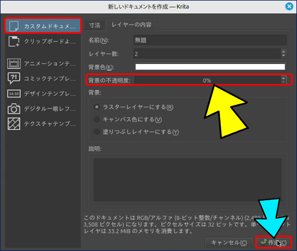 🔵 まず、新しいドキュメントを作成し、背景を透明に設定します。(背景レイヤー)