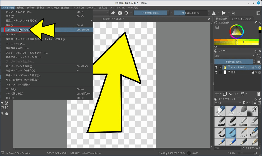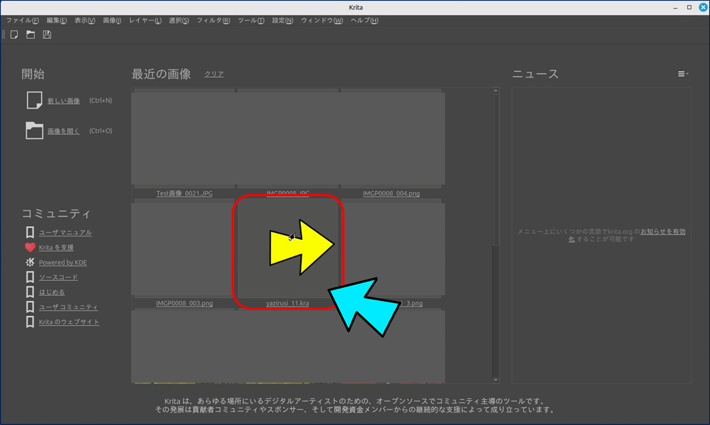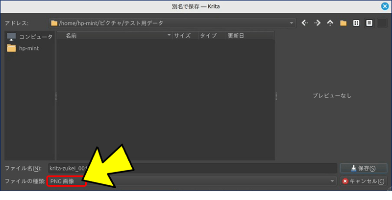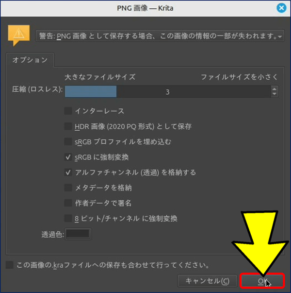 📌 ポイント:拡張子を .kra で保存しておくと、Kritaの作業環境をそのまま保持でき、作業を継続して再開できる。