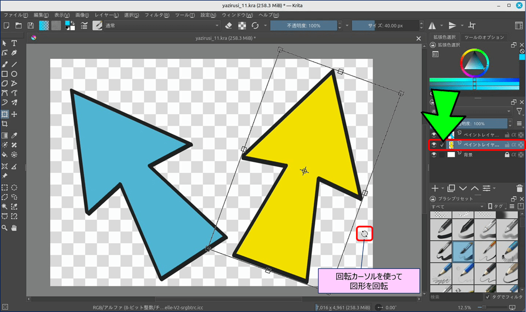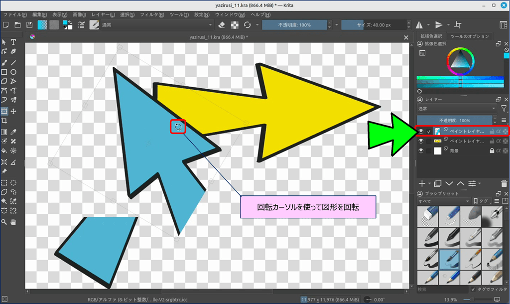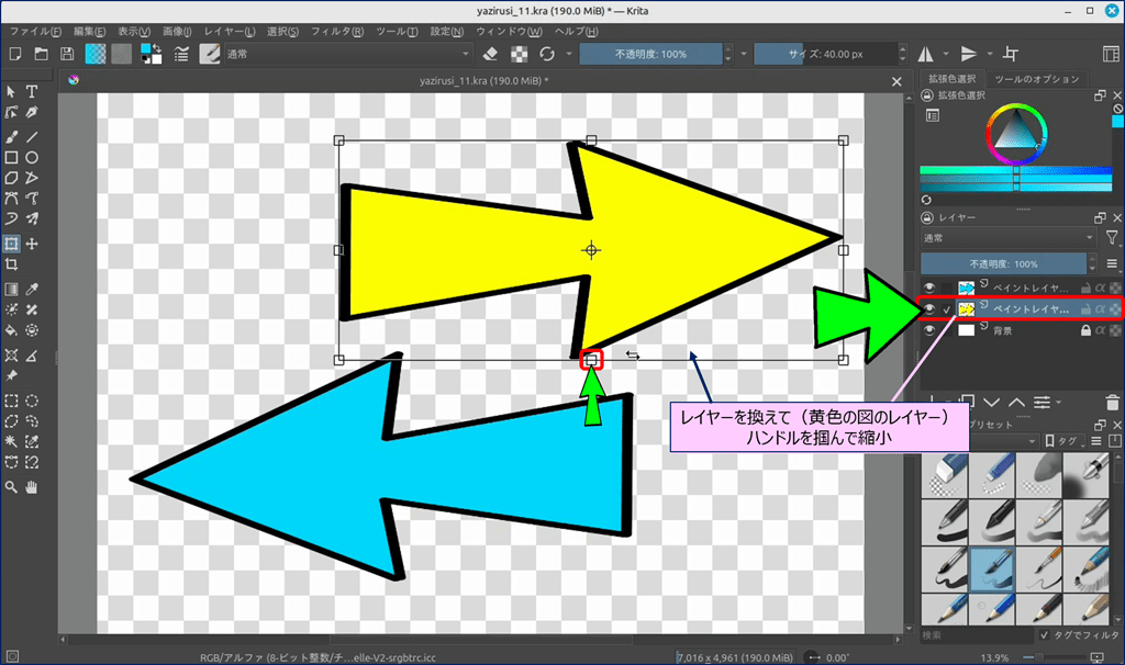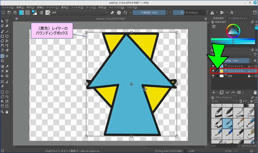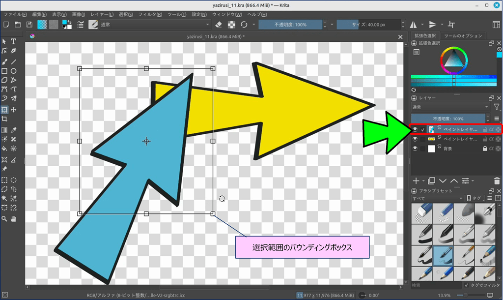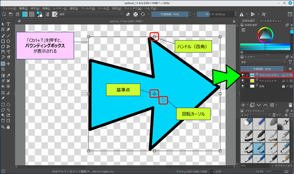 🎯 Krita には、ショートカットキーで表示できる「バウンディングボックス」という便利なツールが用意されており、このツールを使えば図形を自由に変形できる。