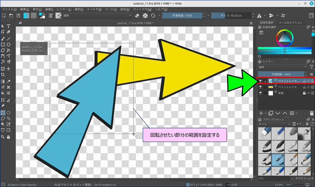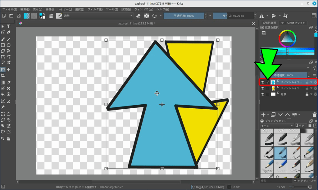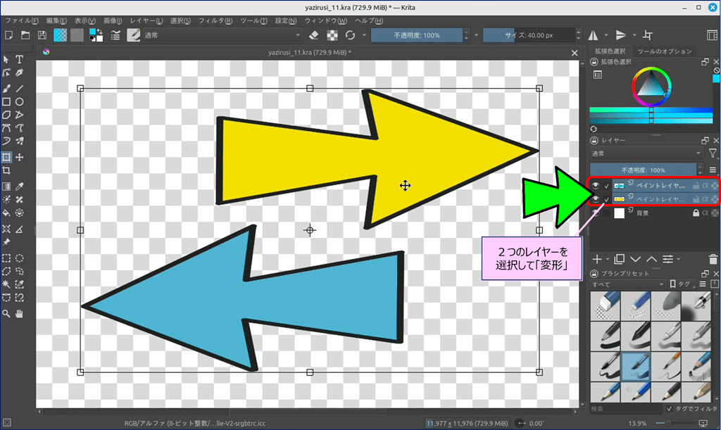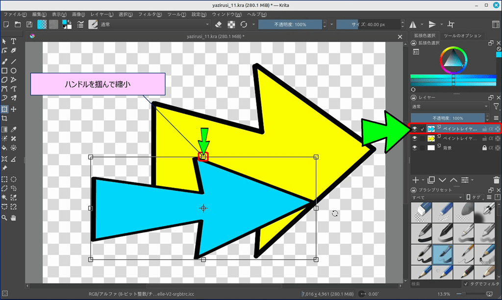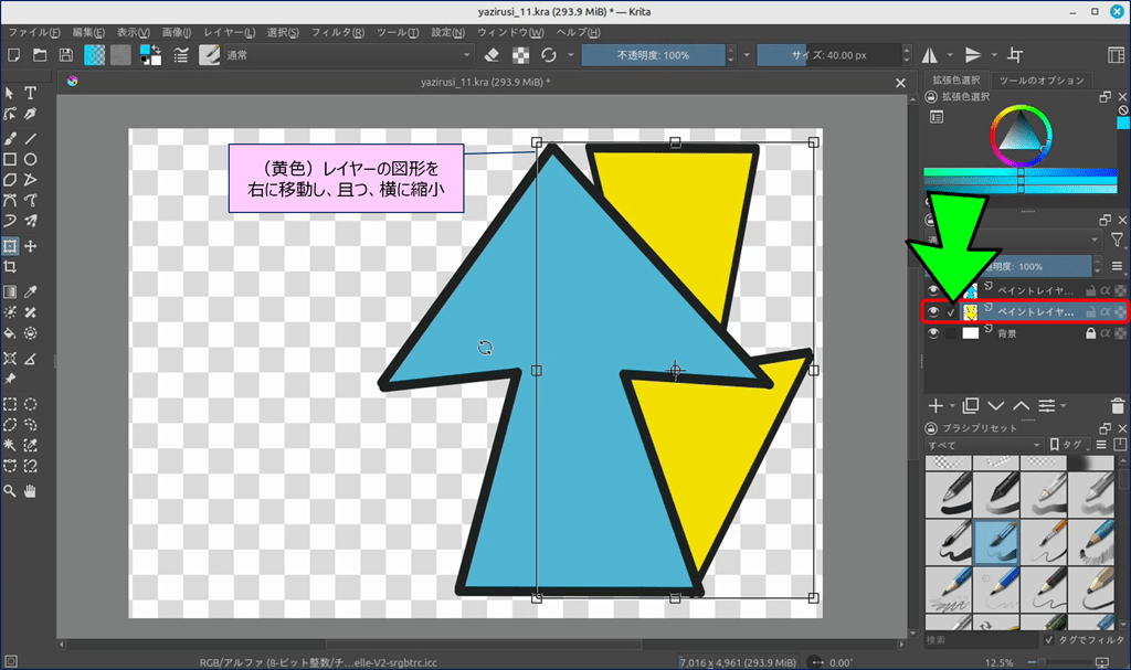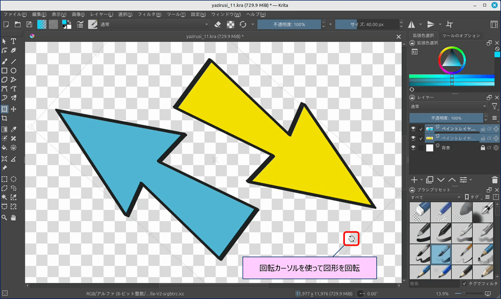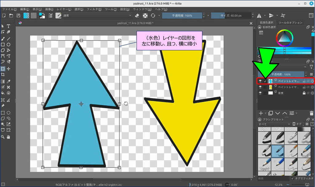 🎯 Krita には、ショートカットキーで表示できる「バウンディングボックス」という便利なツールが用意されており、このツールを使えば図形を自由に変形できる。