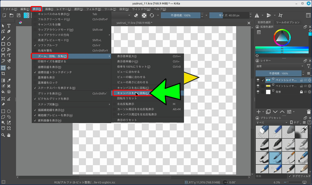 表示 > ズーム、回転、反転 > キャンバスを 右 / 左に回転
