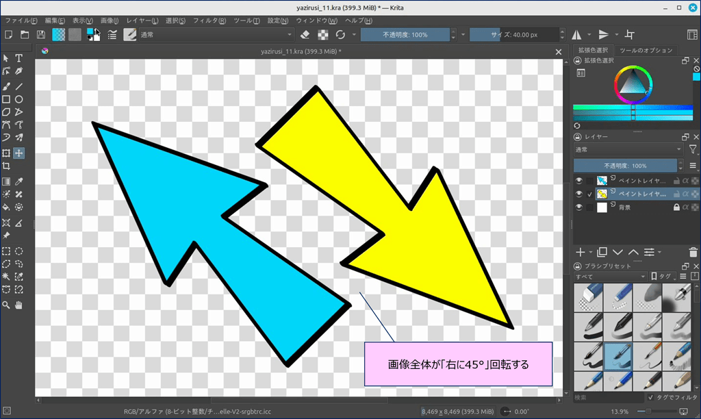 この記事では、Krita の主な回転方法—「キャンバスの回転、画像全体の回転、レイヤーの変形、選択範囲の回転」—を、具体的な手順とともに解説しています。