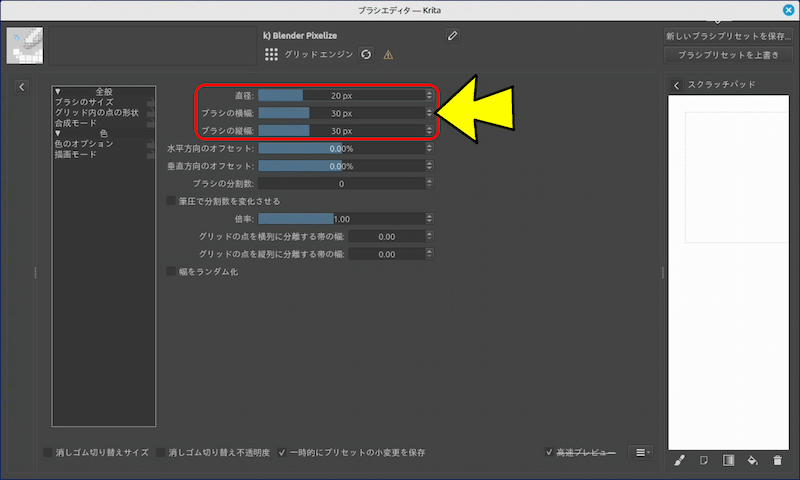 ブラシの横幅と縦幅を等しい大きさに変更し、モザイクの1pxの大きさを設定する。