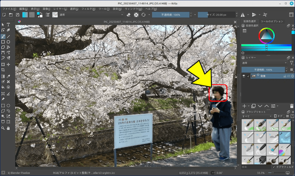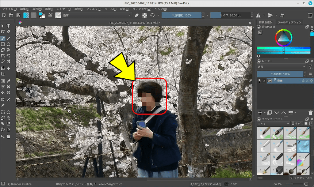 画像をウェブサイトにアップする場合、人物の顔や個人情報などを隠すために、モザイクをかけたい場合がある。Krita では、Photoshop のような高価なソフトを使わなくても、Linux 上で手軽にモザイク加工が可能です。