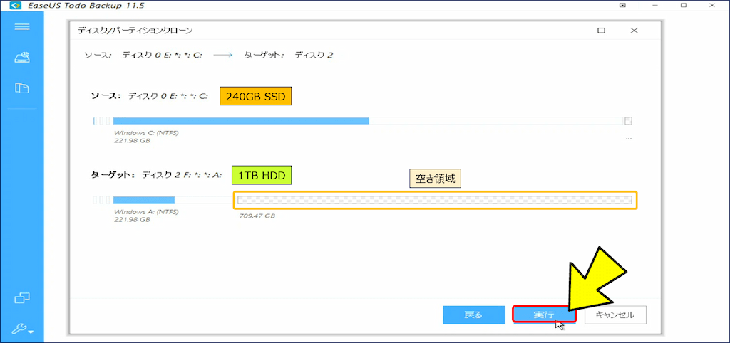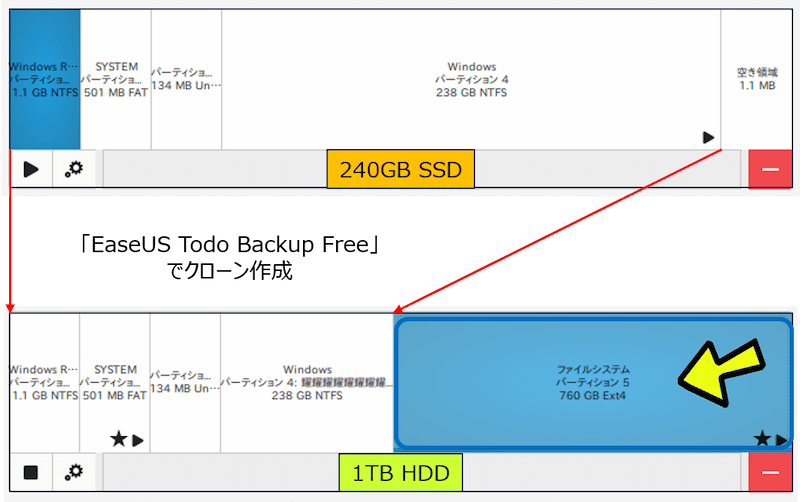 240GB → 1TB にクローンすると、700GB 以上の空き領域が出来るので、ここに、Linux Mint がインストール出来る。