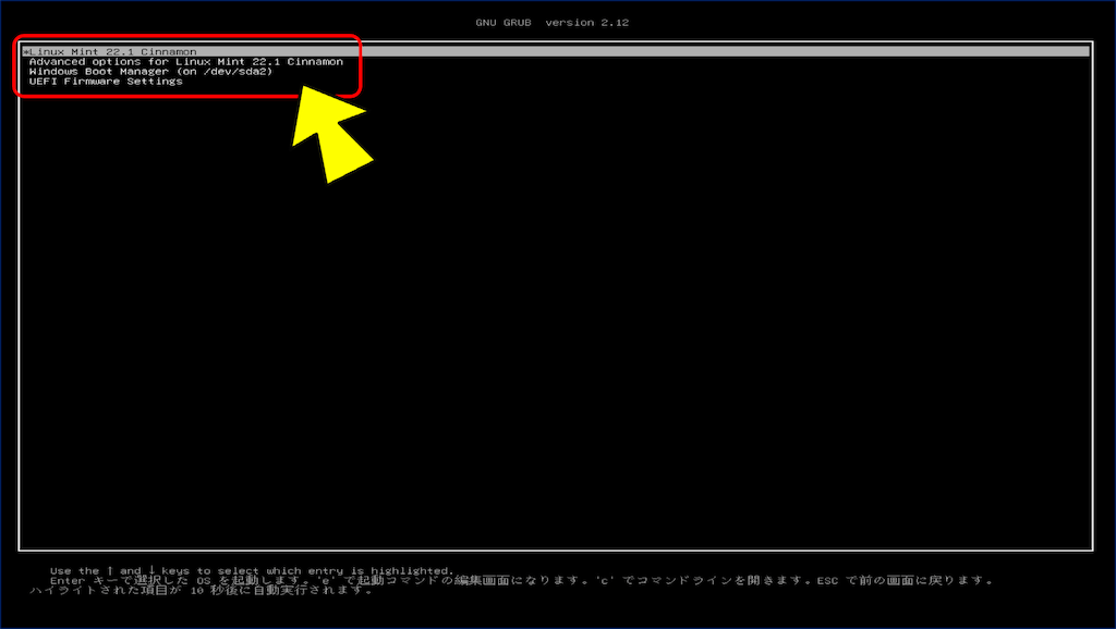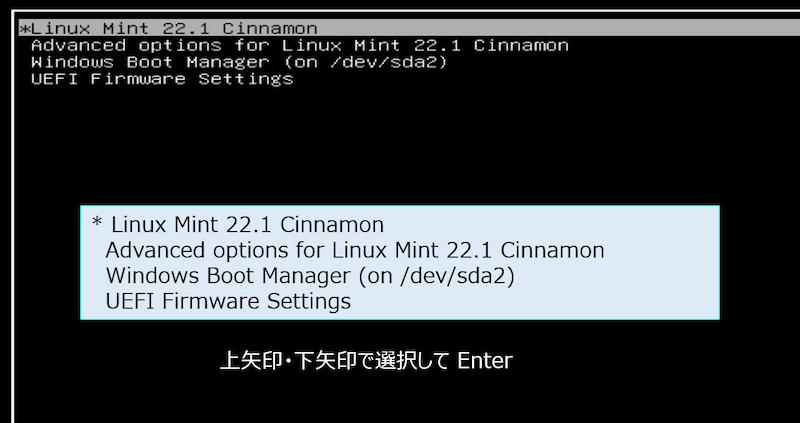 Windowsを起動したい場合は、下矢印で選択して Enter キーを押す。