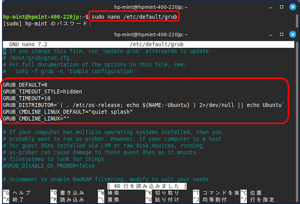 GRUB_TIMEOUT=20 :メニュー表示時間を20秒に変更