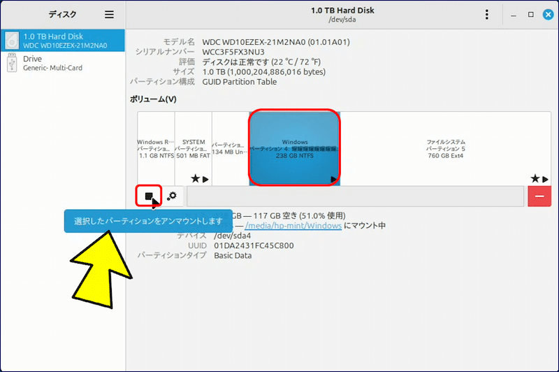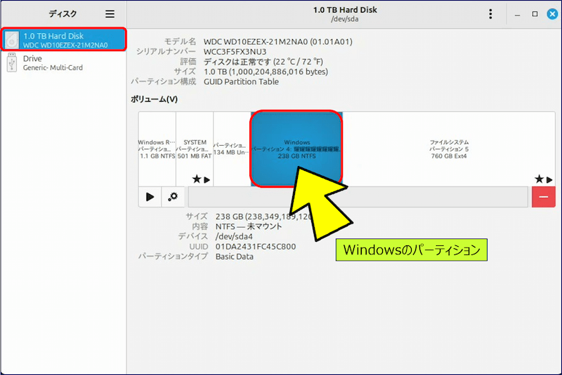 → これをしないと、LinuxからWindowsパーティションにアクセスできないことがある。
