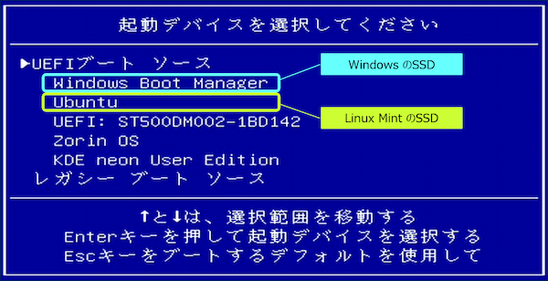 これで、起動時に「Linux Mint か Windowsか」起動するOSが選択が出来るようになる。