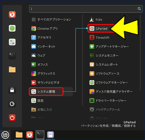 ![[メニュー] → [システム管理] → [GParted]を選択する](https://arakoki70.com/wp-content/uploads/2025/11/gparted_1111.png)