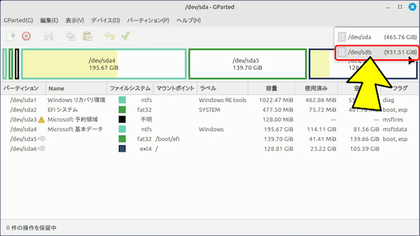 🔹 右上のドロップダウン「デバイス選択」で、 /dev/sda や /dev/sdb など、操作対象のディスクを選択する。