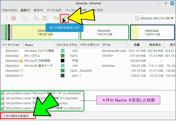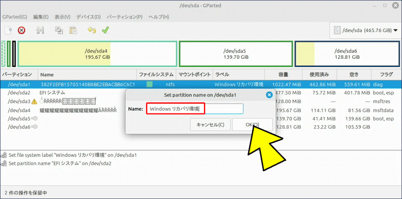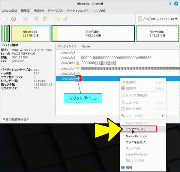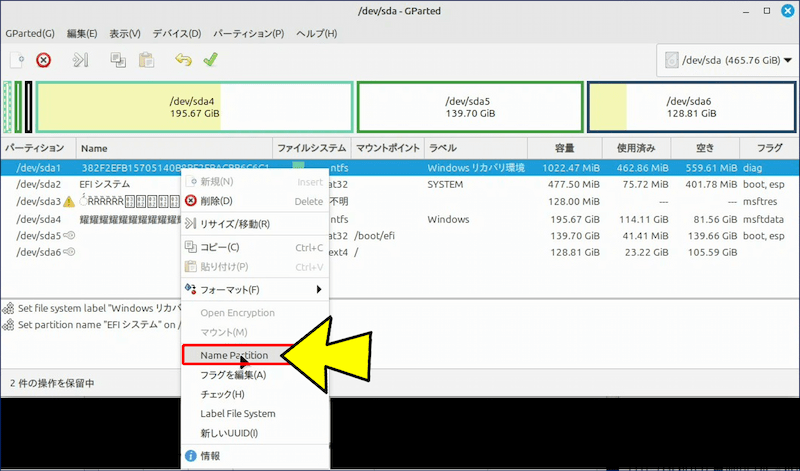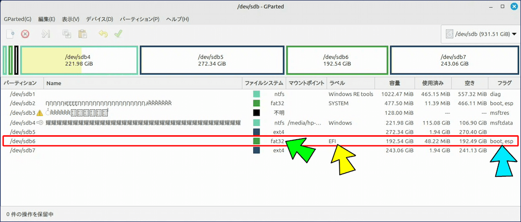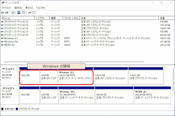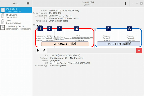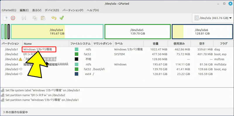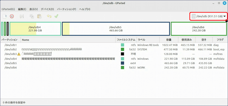 上記の【文字化け】しているデバイスは、「デュアルブート構成」のディスクで、【文字化け】しているパーティションは Windows がインストールされている領域となっている。