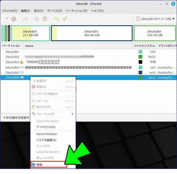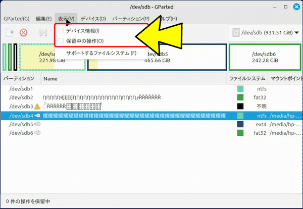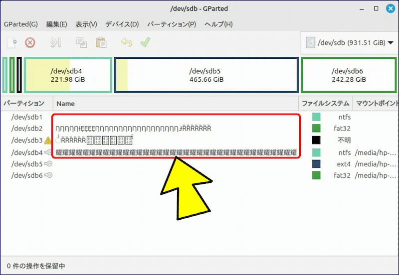 これは、フォントやロケールの問題ではなく、ファイルシステムのラベル(パーティション名)の文字コードの扱いによるもので、「FAT32」や「NTFS」のパーティションが【文字化け】している。