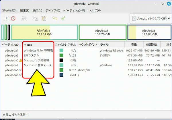 fdisk で表示される「タイプ」は、パーティションの用途を示す識別コード(GUIDまたはID) であり、GParted の「Name」とは別の情報だが、やむなくこの名称を転用する。