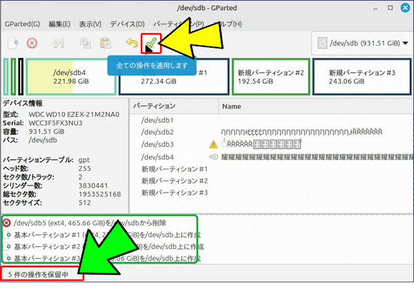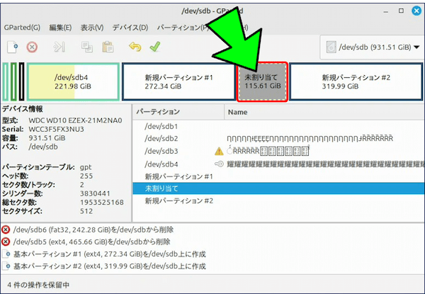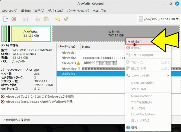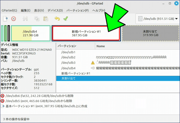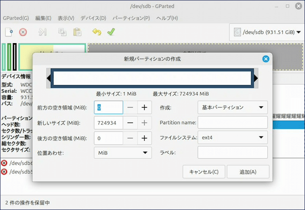 • GParted は非常に強力なツールです。誤った操作をするとデータが消える恐れがあります。