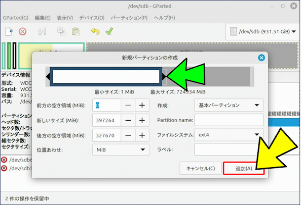 | 新しいサイズ | 作成するパーティションの容量 (例:512 MB) |