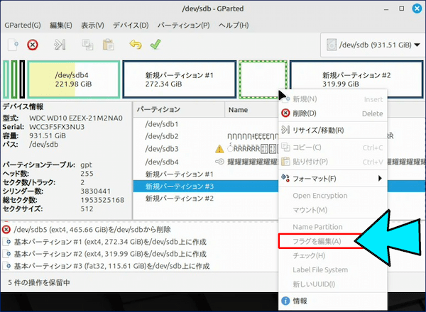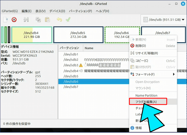 この時点では「パーティションの作成」が実行されていないため、「フラグを編集」項目が選択できない。実際にはパーティションが作成されていない。