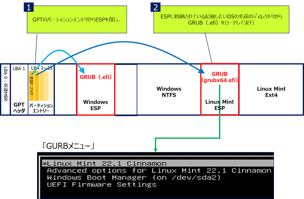 🔹このパーティションエントリからESPを探し、ESPに格納されている「起動したいOSの名前」のディレクトリから、GRUB(例: grubx64.efi)をロードして実行する。