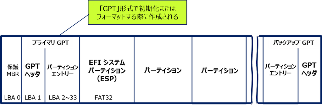 ● 保護MBR:GPT非対応のツール等がMBRとしてアクセスしてGPTを破壊しないように空き地にしています。