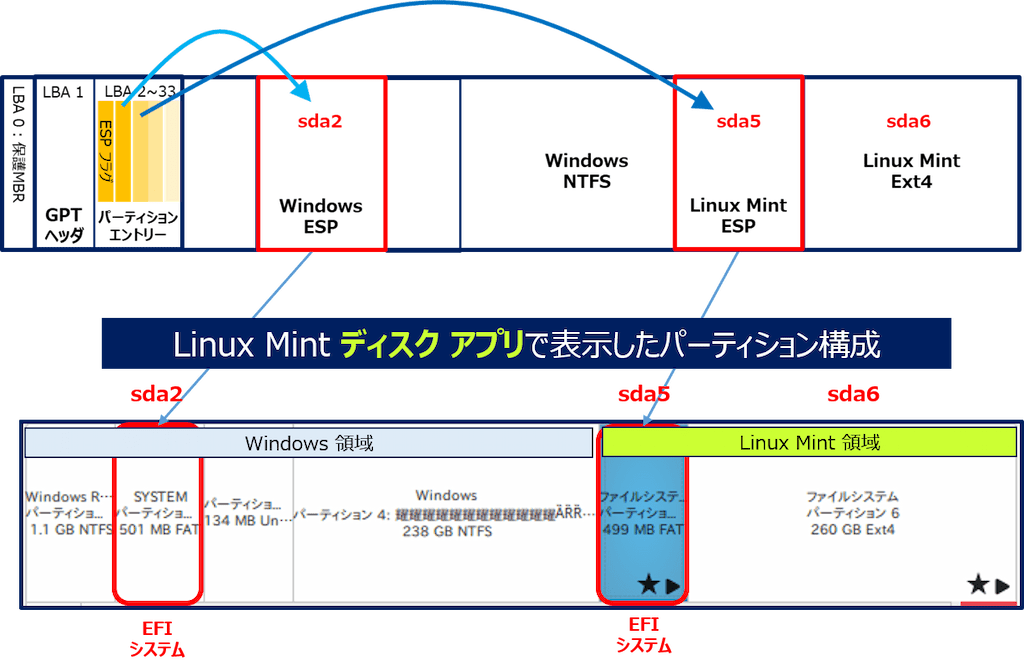 🔵 デュアルブートディスクのパーティション構成(Linux Mint での分析)。