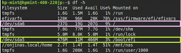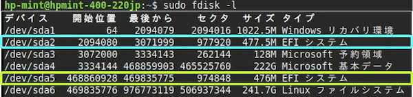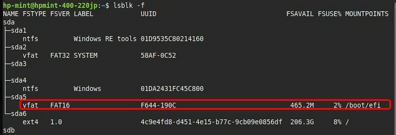 sda5:Linux Mint の ESP は、「/boot/efi」にマウントされていることが判る。