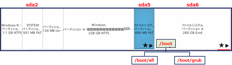 sda6:Linux Mint の ルートディレクトリー / で、/boot ディレクトリーに「/boot/efi」と「/boot/grub」の2つが配置されている。