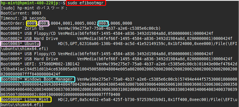 • UEFI NVRAM にブートエントリ "linuxmint" を登録(efibootmgr が呼ばれる)