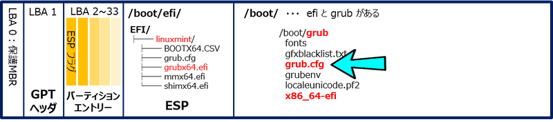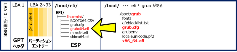 • ESP(/boot/efi)の中に GRUB EFI アプリを配置