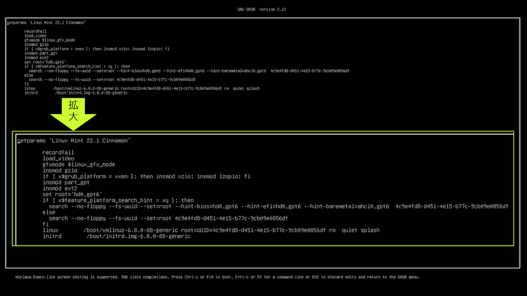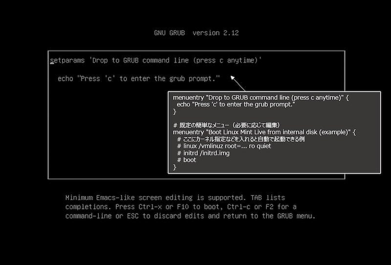 この手順で linux ...とinitrd ...を指定して Linux Mint を起動するすることが出来る。