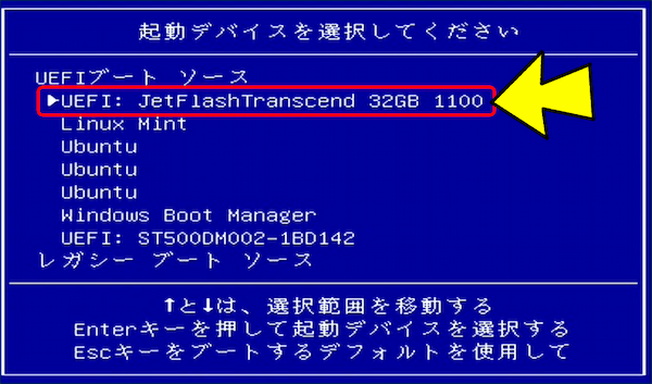 説明:これで /mnt/usb/EFI/BOOT/BOOTX64.EFI に GRUB EFI バイナリが作られます。多くの UEFI は removable path を優先して起動できるので、BIOS 設定で USB を選べば OK。