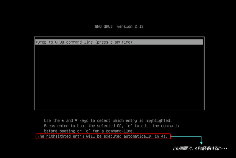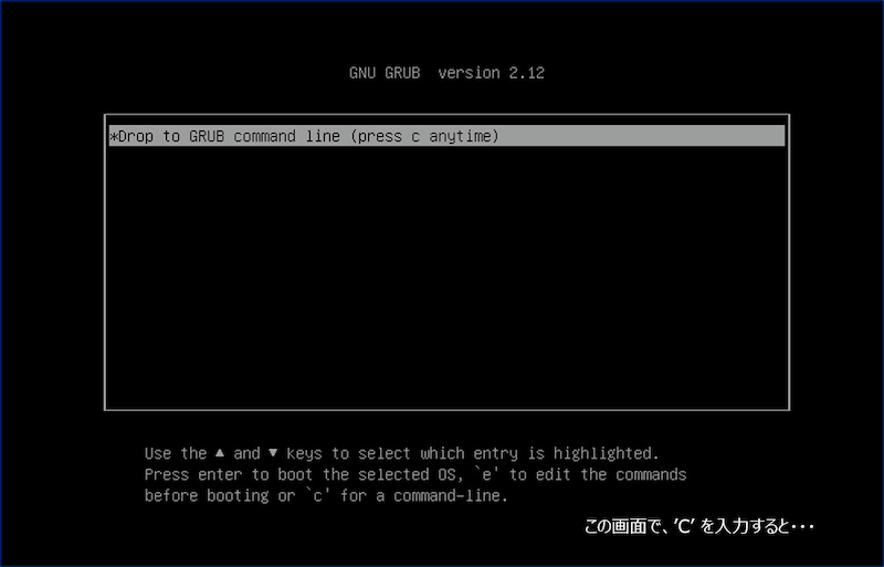 ①.grubメニューが表示されている画面で、キーボードから ”c” を入力する。