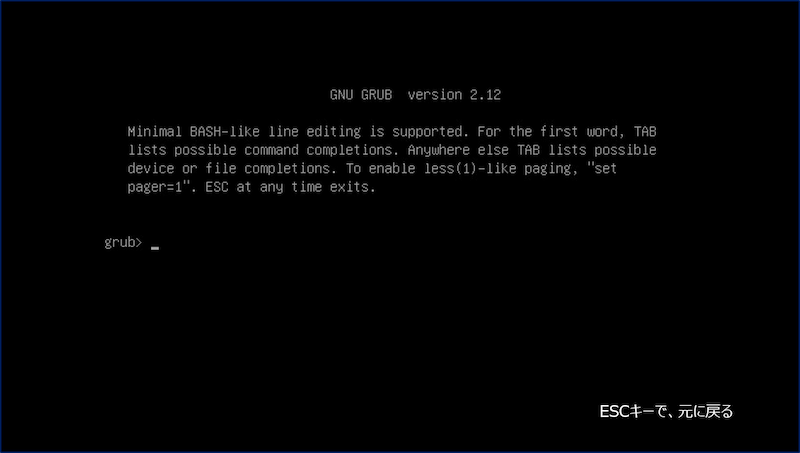 以下、grubコンソールが表示された時に、「コマンドの入力」で切り抜ける方法をまとめた。