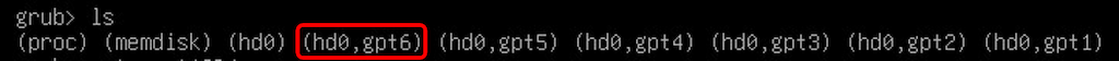 (proc) (memdisk) (hd0) (hd0,gpt6) (hd0,gpt5) (hd0,gpt4) (hd0,gpt3) (hd0,gpt2) (hd0,gpt1)