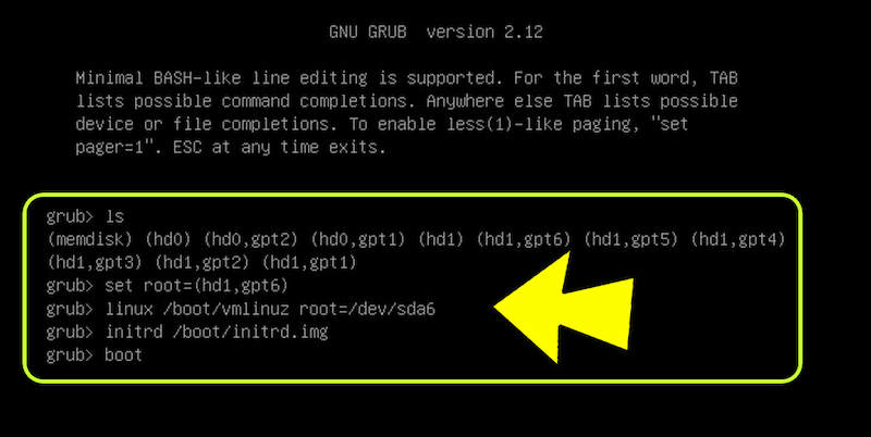 grub> linux /boot/vmlinuz root=/dev/sda6