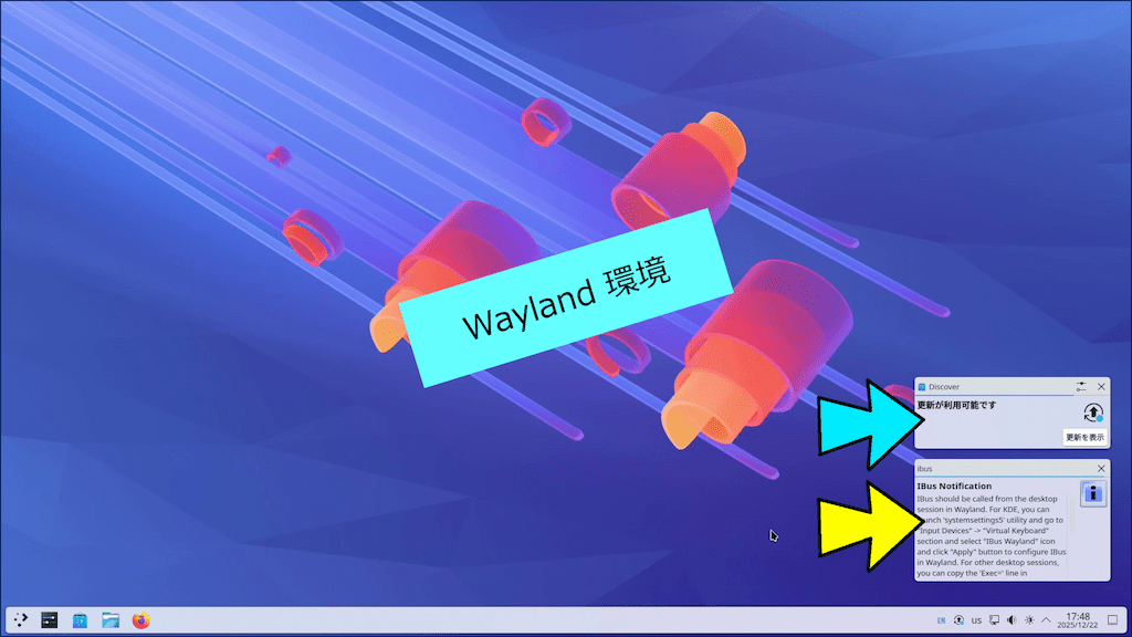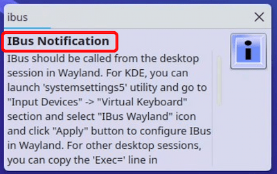 🔔 このメッセージはIBus入力方式フレームワークからの情報通知であり、KDE Plasmaデスクトップ環境上のWaylandディスプレイサーバーセッション内での設定に特有のものです。