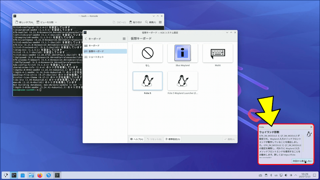 2️⃣ 端末を開いて、「fcitx5」のパッケージをインストールする。