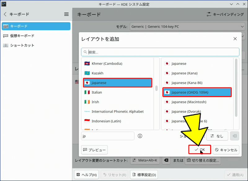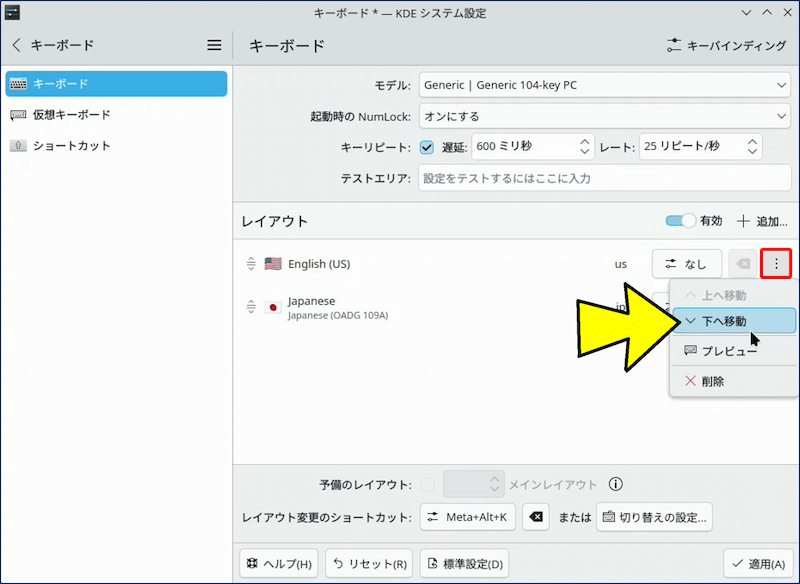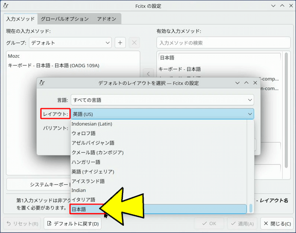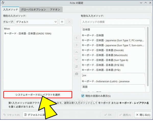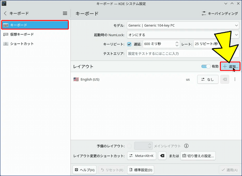 ⭐ 日本語入力はOKになったが、特殊文字の入力に問題があるので「キーボードレイアウト」を追加する。
